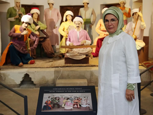 Darüşşifanın yaklaşık altı asır öncesi çağın ötesinde şifa kapısı olduğunu vurgulayan Emine Erdoğan, “Bizim medeniyetimiz şifahaneler kurarak hastalıklara şifa üzerinden yaklaşmış. Şifayı ilaçta olduğu kadar, doğada, yeme içmede, müzikte, yani yaşamın tam ortasında arar. Ve sağlığı, bir yaşam biçimi hâline dönüştürmüştür” dedi.
