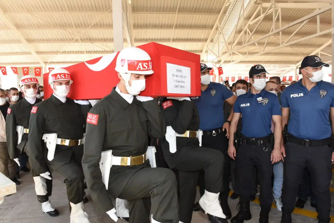 Suriye’nin İdlib kentindeki terörist saldırısı sonucu şehit olan, Şanlıurfa Bozova nüfusuna kayıtlı Piyade Uzman Onbaşı Serdar Aslan’ın cenazesi, Gaziantep’te düzenlenen törenin ardından toprağa verildi.